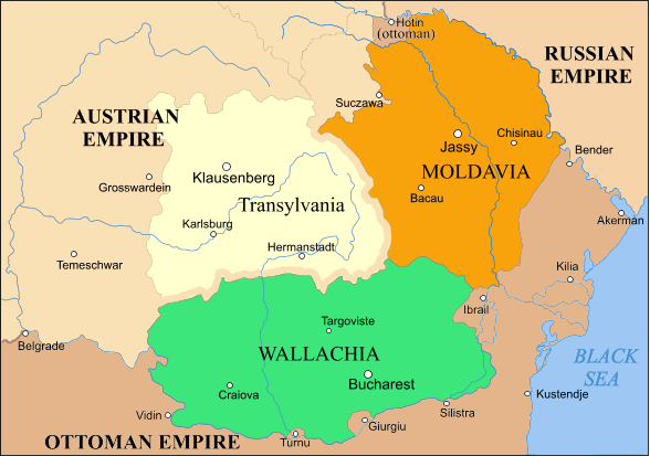Moldova (în portocaliu) şi Valahia (verde), între 1793 şi 1812