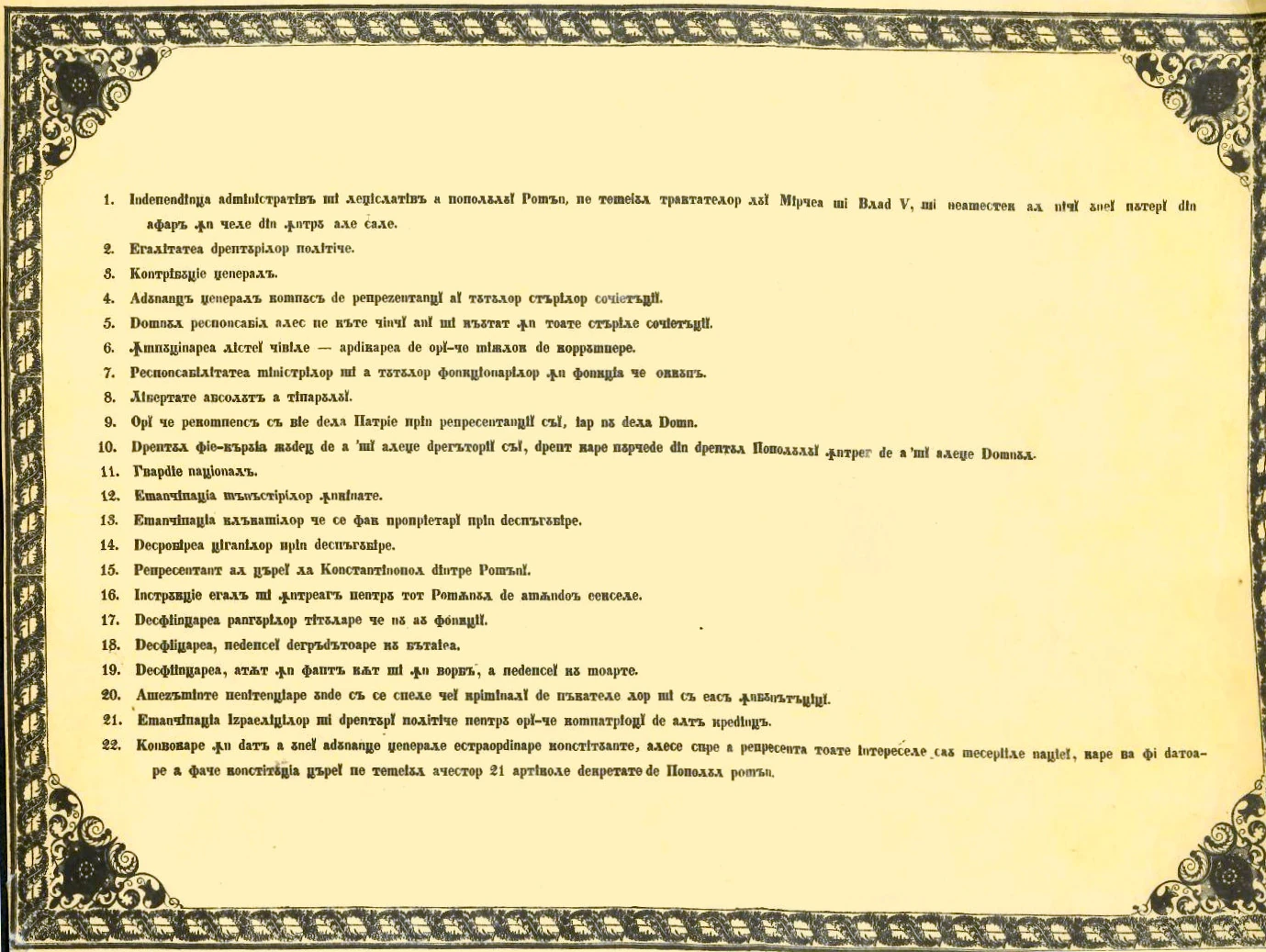 Cea mai importantă dezvoltare culturală din perioada Regulamentului a fost naţionalismul romantic românesc, în strânsă legătură cu francofilia. Modernizarea instituţinală a dus la o renaştere a mişcării intelligentia. În plus, conceptul de "naţiune" a fost estins pentru prima oară dincolo de clasa,[47] şi mai mulţi membri ai claselor privilegiate au început să se preocupe de rezolvarea problemelor ţărănimii, interes împărtăşit de multe figuri politice ale anilor 1840.[48]