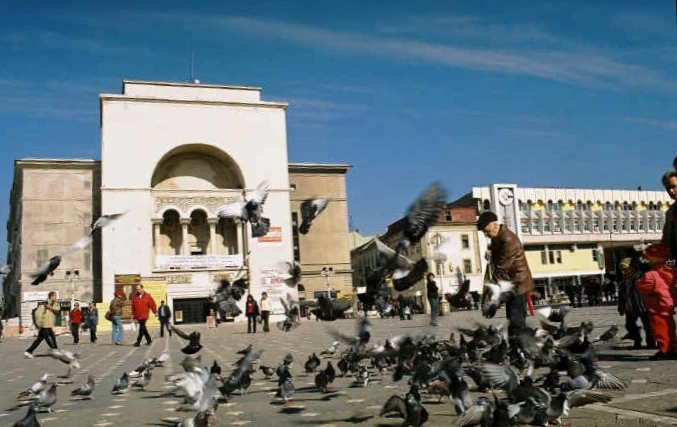 Imagine din Piaţa Victoriei cu clădirea Operei, de la balconul căreia Timişoara a fost declarat primul oraş din România liber de comunism